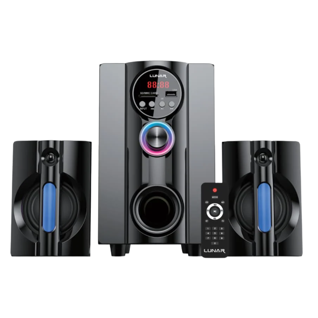 A: A 2.1 system like the AQUA includes two dedicated satellite speakers for high-frequency "treble" and a separate 4-inch subwoofer for low-frequency "bass." This separation ensures that your music doesn't sound "flat," providing a more immersive 3D sound experience compared to single-unit speakers.